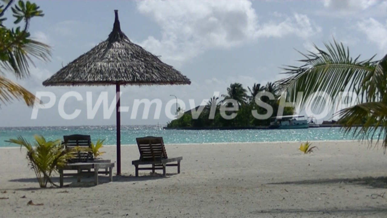 ビーチのデッキチェアとパラソル【MV01-01-00022】